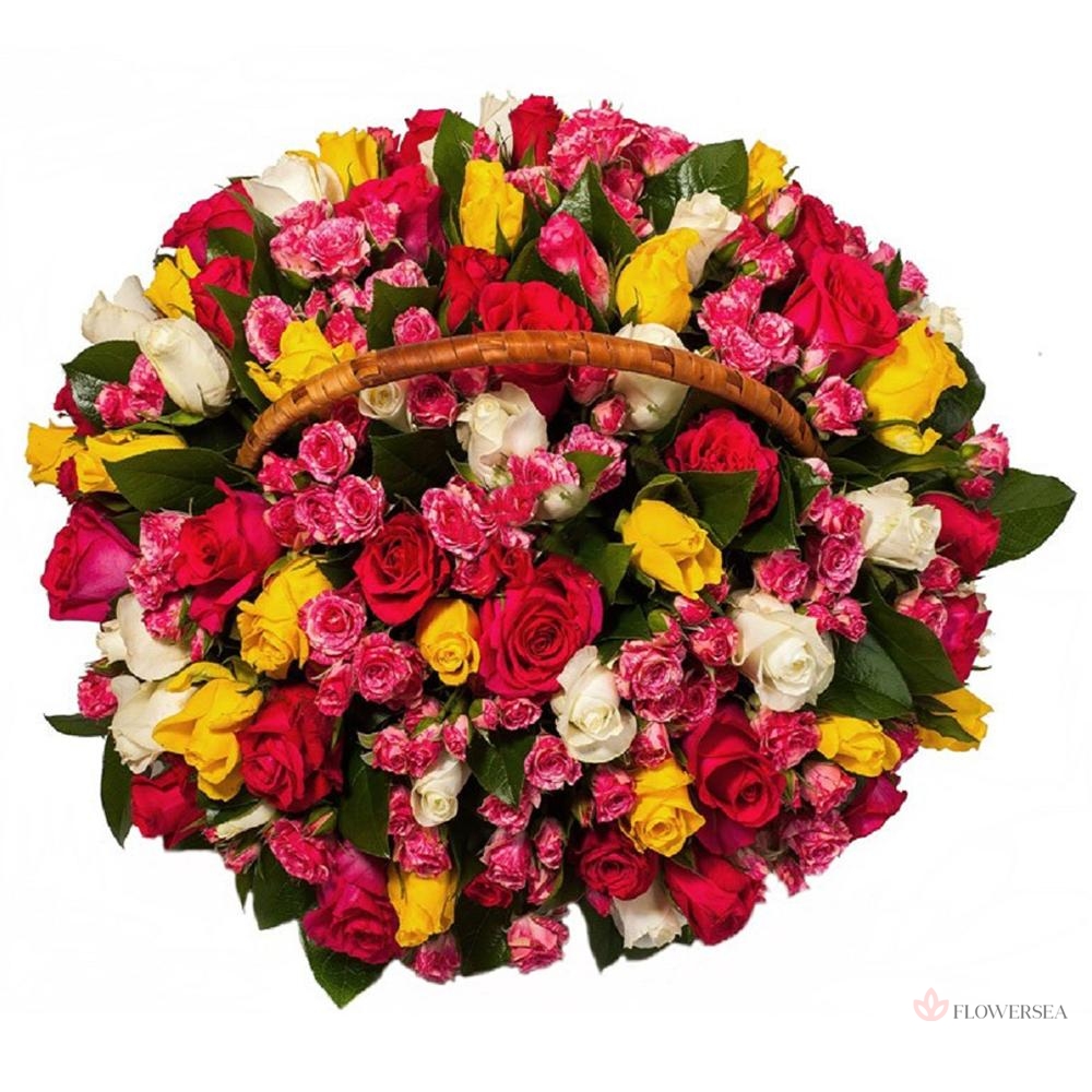 Фонтан із 49 троянд, барвистих кущових гілок різних сортів та квітів у декоративному кошику.