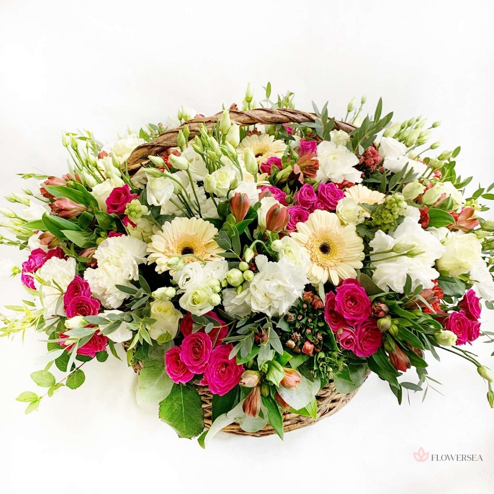 Наче зібраний у літньому полі кошик повітряних та яскравих, ніжних кольорів. Ніжних гербер 5 штук, 5 кущових білих троянд, 5 малинових кущових троянд, 10 альстромерій, 10 гілок еустом та декоративної зелені.