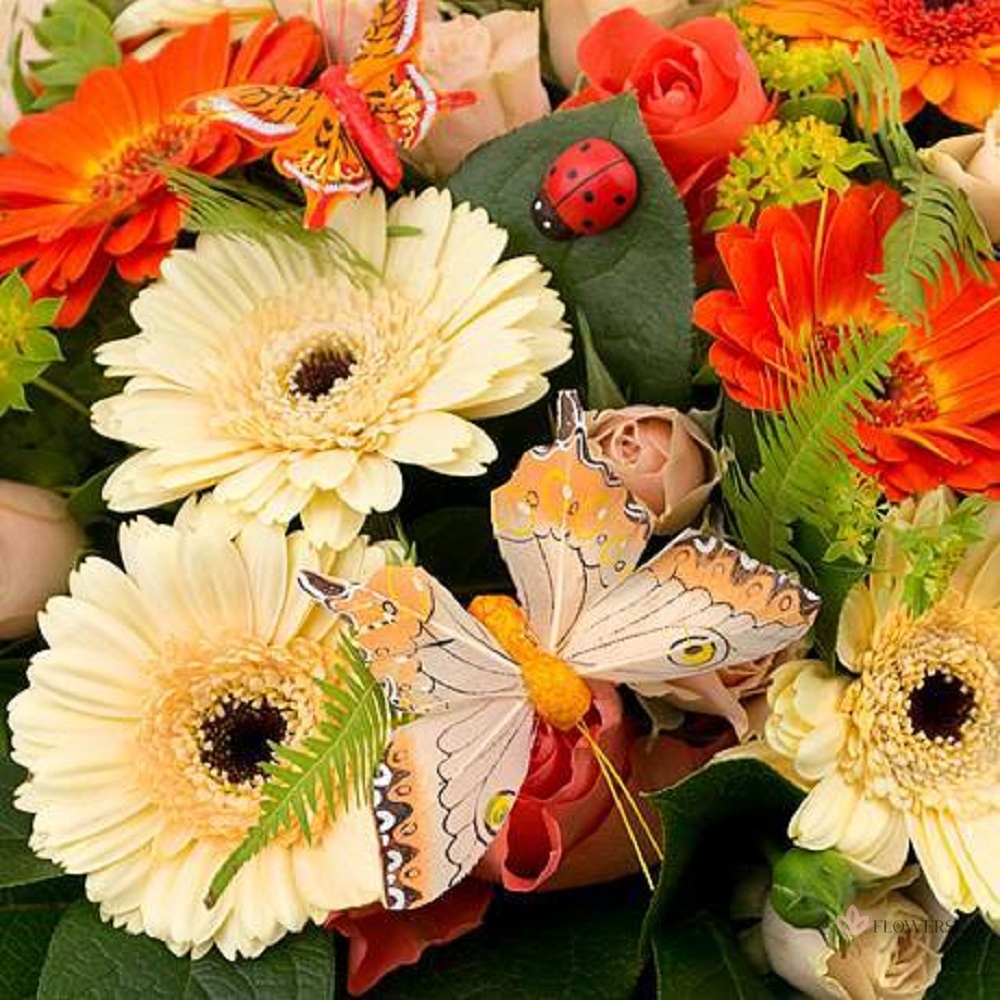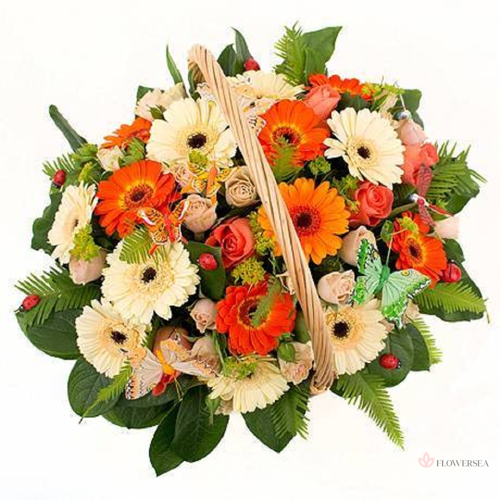 Кошик з 15 гербер і 6 гілок кущових троянд з декоративною зеленню, метеликами та сонечками. Такий подарунок перенесе свого власника на літню галявину із сонячним теплом та барвистим настроєм.