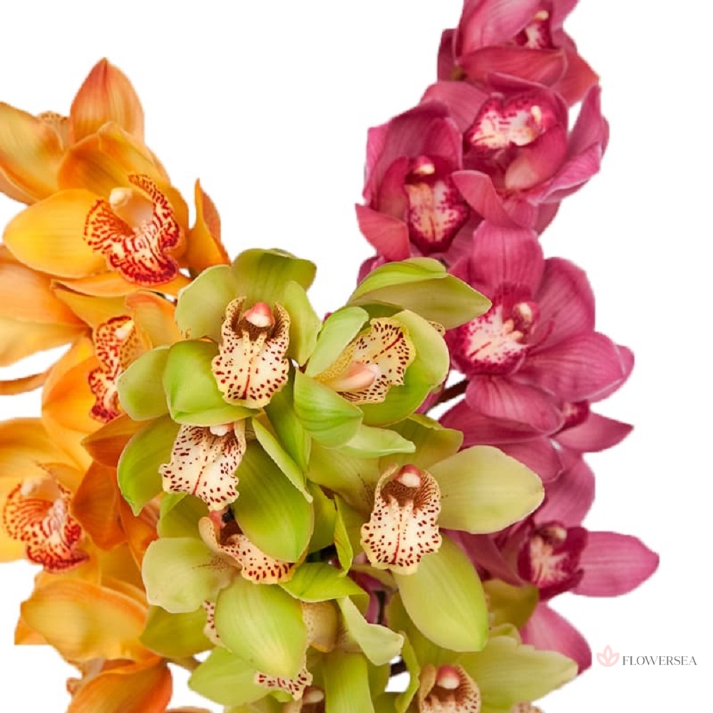 Кошик їх 11 кольорів орхідеї цимбідіум та статиці з декоративною зеленню.