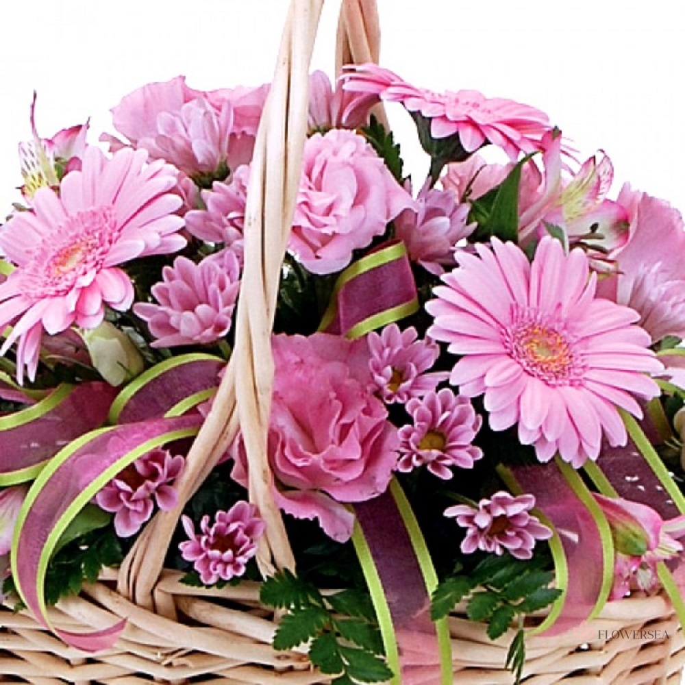 Кошик рожевих кольорів, літнього настрою, ніжності та уваги. До складу входить 3 гербери, 3 еутоми, 3 альстромерії, 3 гілки хризантеми, декоративна зелень та стрічка.